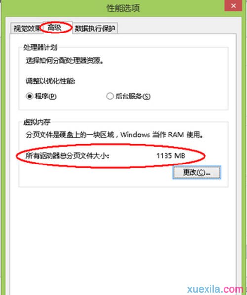5.接下来,我们点击“高级”选项,可以看到当前的“虚拟内存”大小,如下图所示。