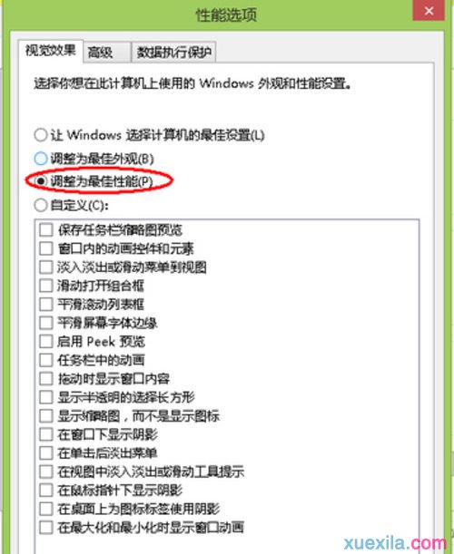 4.在“性能选项”点击“调整为最佳性能”。这样设置的好处在于,牺牲掉视觉效果,从而达到让系减少对硬件资源的占用,如下图所示。