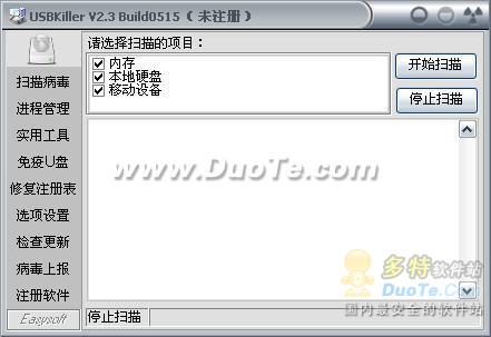 U盘病毒专杀:启动USBKiller,界面如图1所示,点击“开始扫描”就可以扫描U盘里是否有毒。有的话就杀掉。
