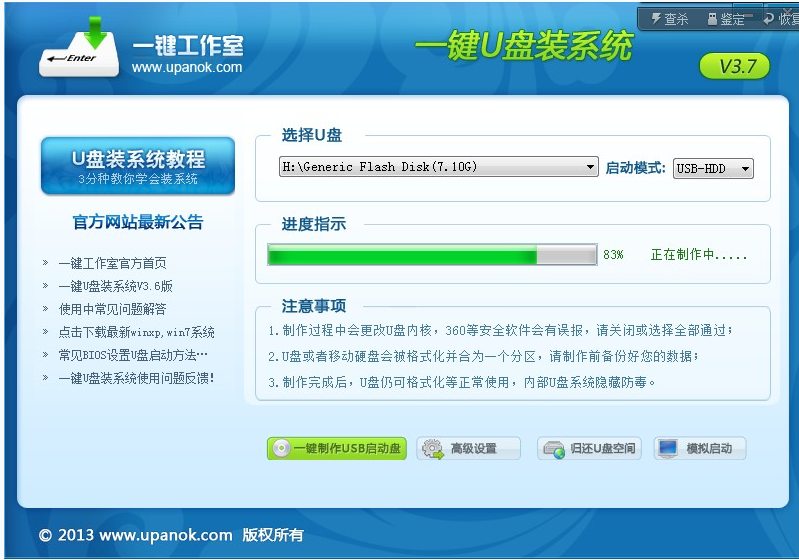 一键u盘装系统V3.7版软件版本:V3.7版软件大小:331MB运行环境:Windows系统下载数量:10004次软件语言:简体中文发布日期:2014-03-26