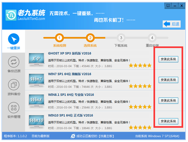 上面文章讲述的方法就是老九一键重装系统教程了,老九一键重装系统傻瓜式的操作,流水线式的安装流程,而且自动帮你们匹配适合电脑配置的系统,不会随便安装系统给你们,这么多优点的软件,还有谁,大声告诉我!还有谁!所以毫无疑问就是老九一键重装系统软件了,同时还有友用一键重装系统以及得得一键重装系统教程可以参考下。