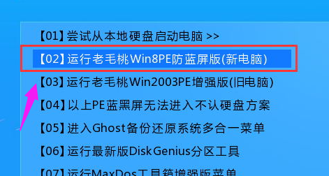 插入u盘,按相应快键键进入主菜单,选择【02】运行老毛桃Win8PE防蓝屏版(新电脑),进入pe系统