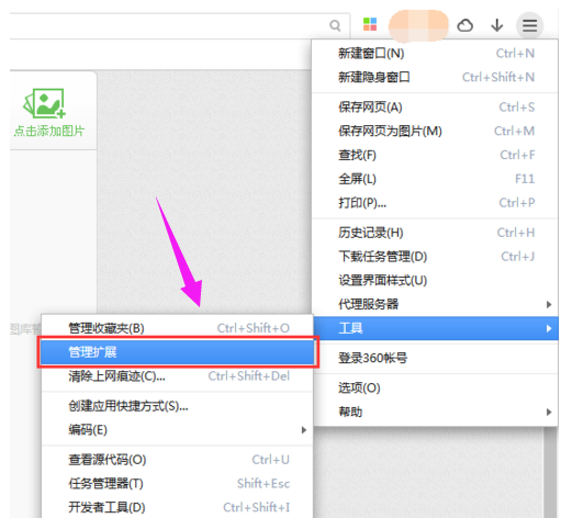 这里介绍一个浏览器插件的方法,演示中用到的是360极速浏览器,点击浏览器的右上角的主菜单,选择工具----管理扩展