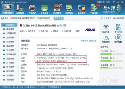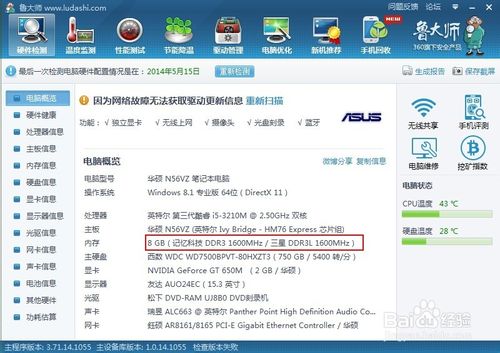 9、再次用鲁大师检测,可以看到电脑成功识别了刚才安装的内存。在电脑属性里亦可以看到安装过4G内存条后内存的总容量。