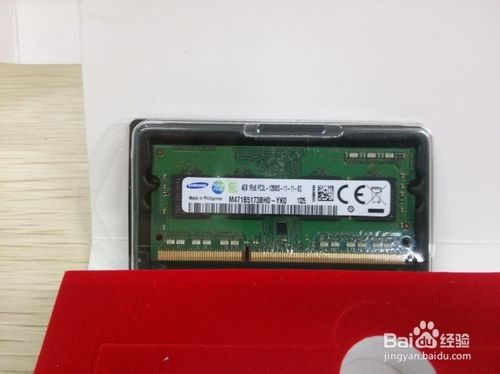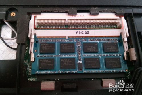 7、将内存条插入到上图(右)中红色框内位置,听见“啪”一声响,即安装成功