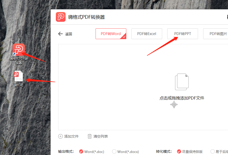1、要转化PDF文件我们需要下载一个PDF格式转换器,打开,选择好需要转换的格式,将我们要转换的文件拖进里面去。