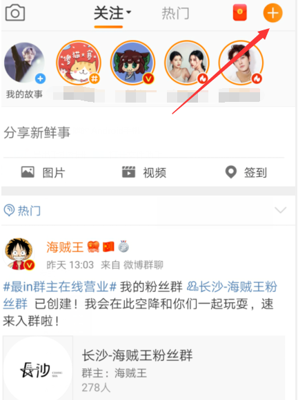 1、打开微博,点击右上角的加号。