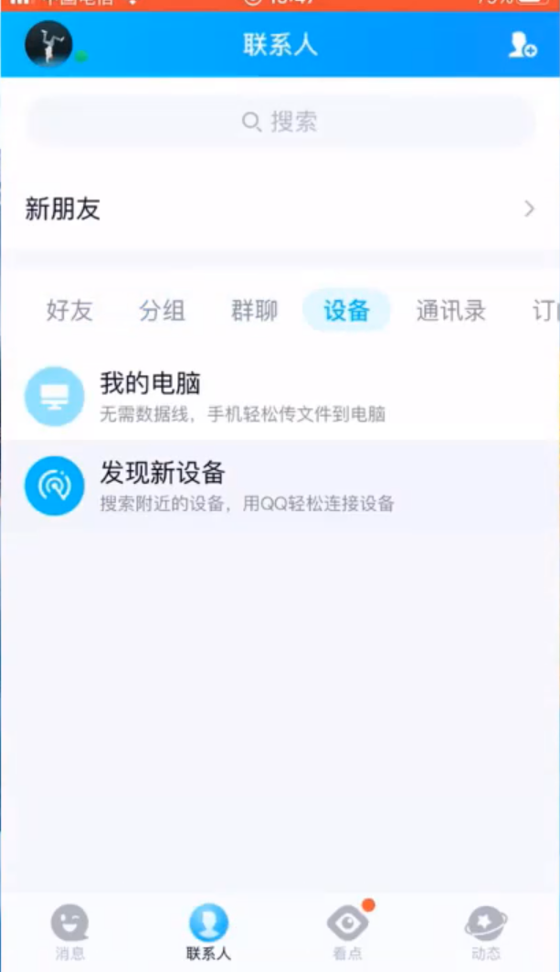 1.打开QQ,点击联系人,选择设备,发现新设备。