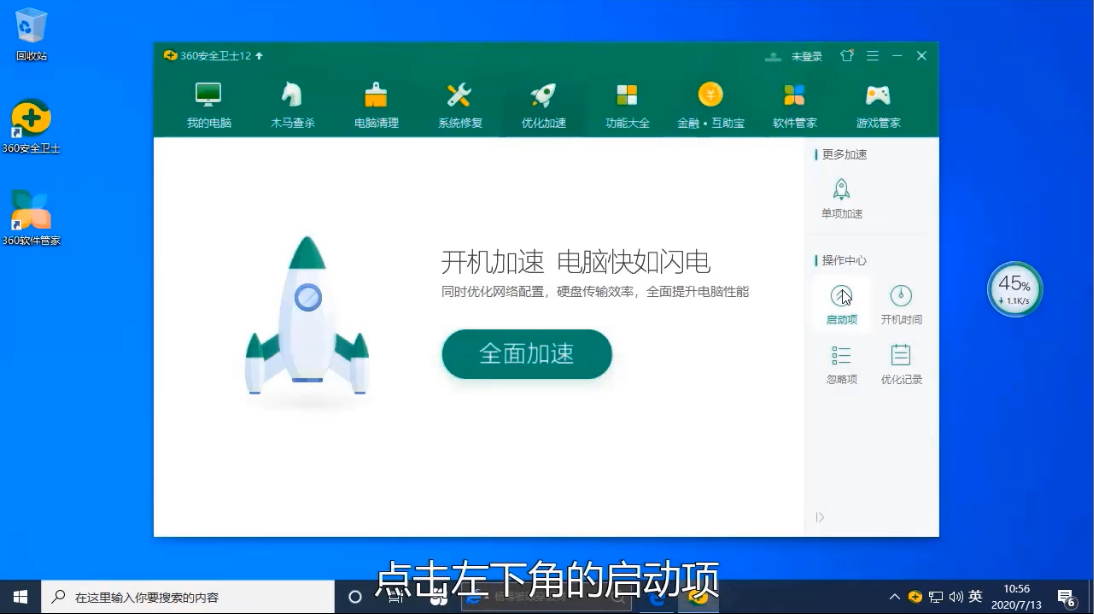 1、打开360安全卫士,点击“优化加速”,然后点击右下角的“启动项”。