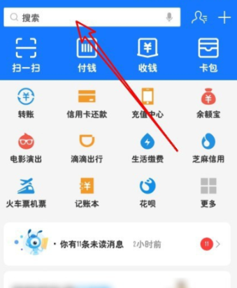 1、首先,在电话屏幕上单击“支付宝”图标,然后打开软件的主界面,然后单击顶部的搜索框。