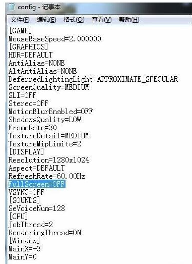 2、等到鼠标变了的时候,找到我的文档里面的 CAPCOM -----> RESIDENT EVIL 6 -----> config.ini 就多了这个 config.ini 这个文件;然后打开它:修改一下下面 FullScreen=ON ------> FullScreen=OFF 把全屏修改成窗口模式。(鼠标不变是不会出现这个文件的),如下图所示: