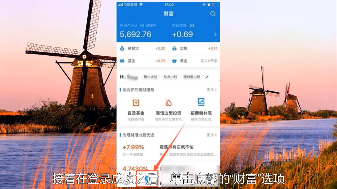 1、首先登录自己的支付宝账户,然后点击下方的【财富】。