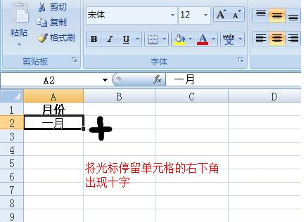 2.将光标置于一月单元格的右下角,并出现一个黑叉