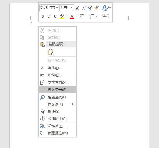 1、首先,启动电脑上安装的 Word,我这里使用的是 Word 2016 版。新建一个空白页面。对着右键,在弹出的菜单选项中选择:插入符号。