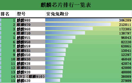 1、以下是麒麟芯片安兔兔跑分榜。