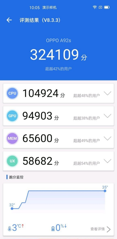 1、本篇文章中使用了 OPPO A92s 手机,该手机采用的是联发科天玑800处理器,在样机演示的跑分中我们可以看到,该机型得到了 324109 分。
