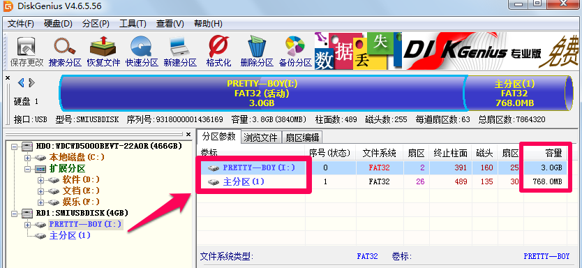 1、diskgenius合并分区的方法很简单,首先打开diskgenius软件,大家可以看到一个带有两个分区的硬盘,接下来小编给大家介绍怎么合并成一个。