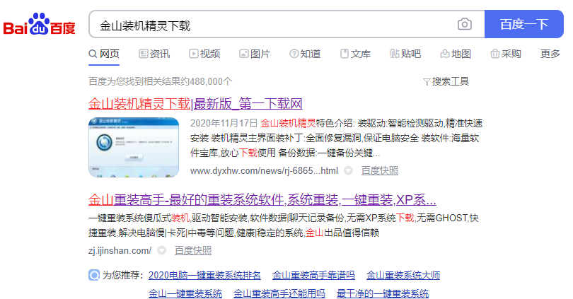 1、首先,可以直接百度搜索金山装机精灵,即可在网上找到金山装机精灵下载版本,下载安装。