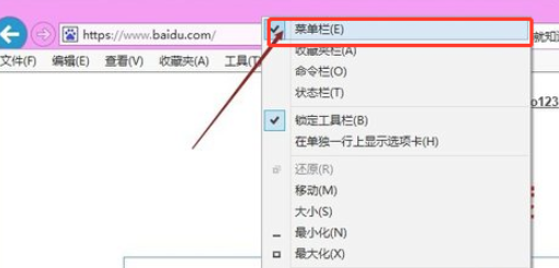 1.打开IE浏览器,如果没有看到菜单栏导航的话,我们可以在IE浏览器的最上方的空白处右键鼠标将菜单栏勾选中。
