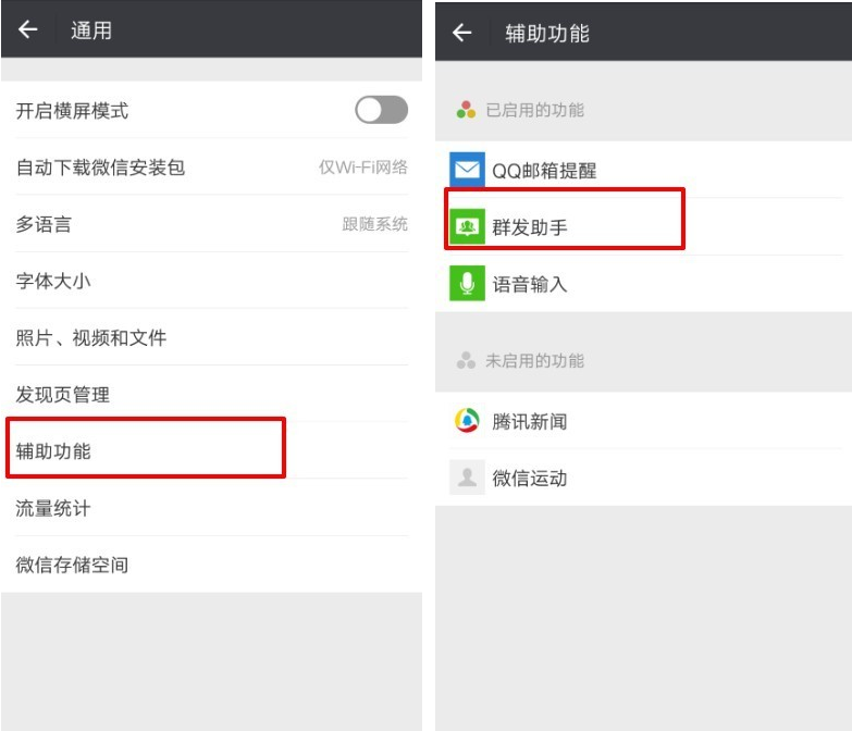4、在辅助功能页面,选择“群发助手”,进入群发助手设置页面。