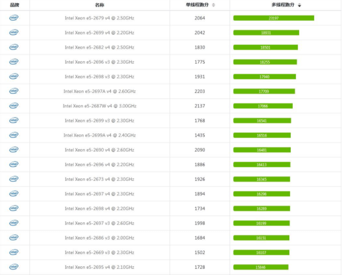 1、下图就是2020年5月至强e5天梯图排行天梯图了,不明白至强e5系列cpu性能的朋友可以参考该天梯图,由天梯图可知至强e5系列的单线程和多线程跑分,例如第一名的Xeon e5-2679 v4,这款CPU单线程跑分为2064分,多线程跑分为23197分。