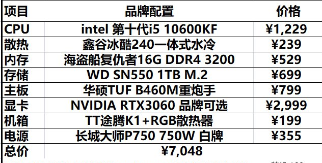 1、CPU intel i5 10600KF采用当前热门第十代I5 10600KF 默认主频4.1 睿频4.8G 6核心12线程 12MB缓存 带F必须要搭配独立显卡,可以超频,默认就行了 咱不超。超频主板太贵~,高主频对游戏帧数有加成,历代最强i5就是它了。