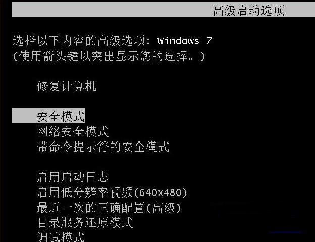 1、如果电脑是进入到系统不久就蓝屏,那我们只能通过安全模式进行一键还原了。首先将电脑开机,同时不管点击F8键,当屏幕显示高级启动选项时,使用方向键选择安全模式进入。