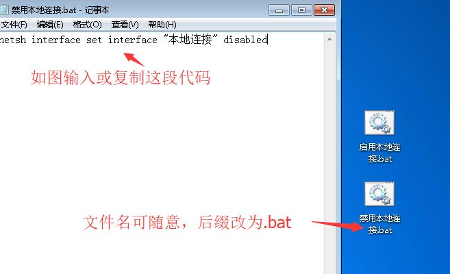 1、新建一个txt文本,复制这段代码:netsh interface set interface "本地连接" disabled 到txt文本里面。意思为禁用本地连接。保存,把文件后缀改为.bat。