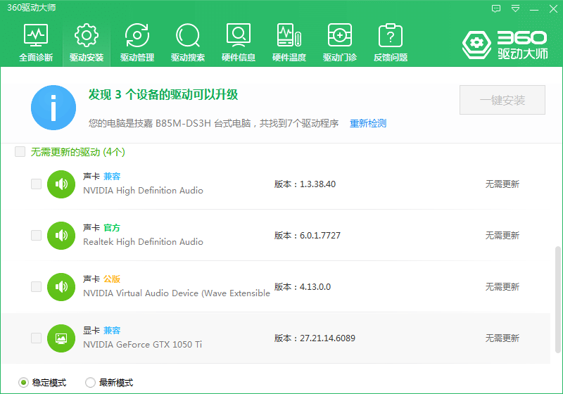1、当电脑显示器出现花纹时我们可以先尝试使用360驱动大师把当前电脑中的显卡驱动卸载或者升级到最新版本,以排除因驱动原因导致的花屏。