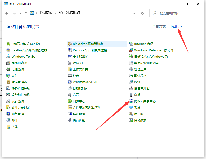 1、我们打开控制面板,点击小图标,然后在下面找到那个网络和共享中心进入。