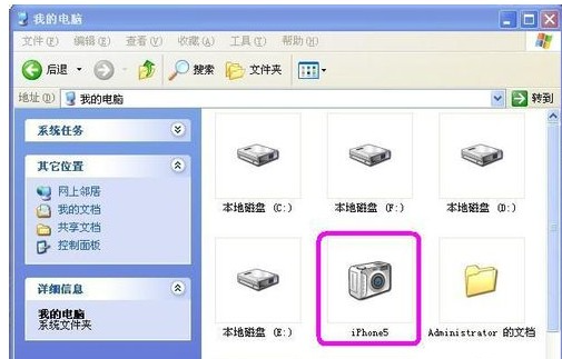 1、将苹果手机数据线连在电脑上,在我的电脑里面打开显示检测到iPhone 。