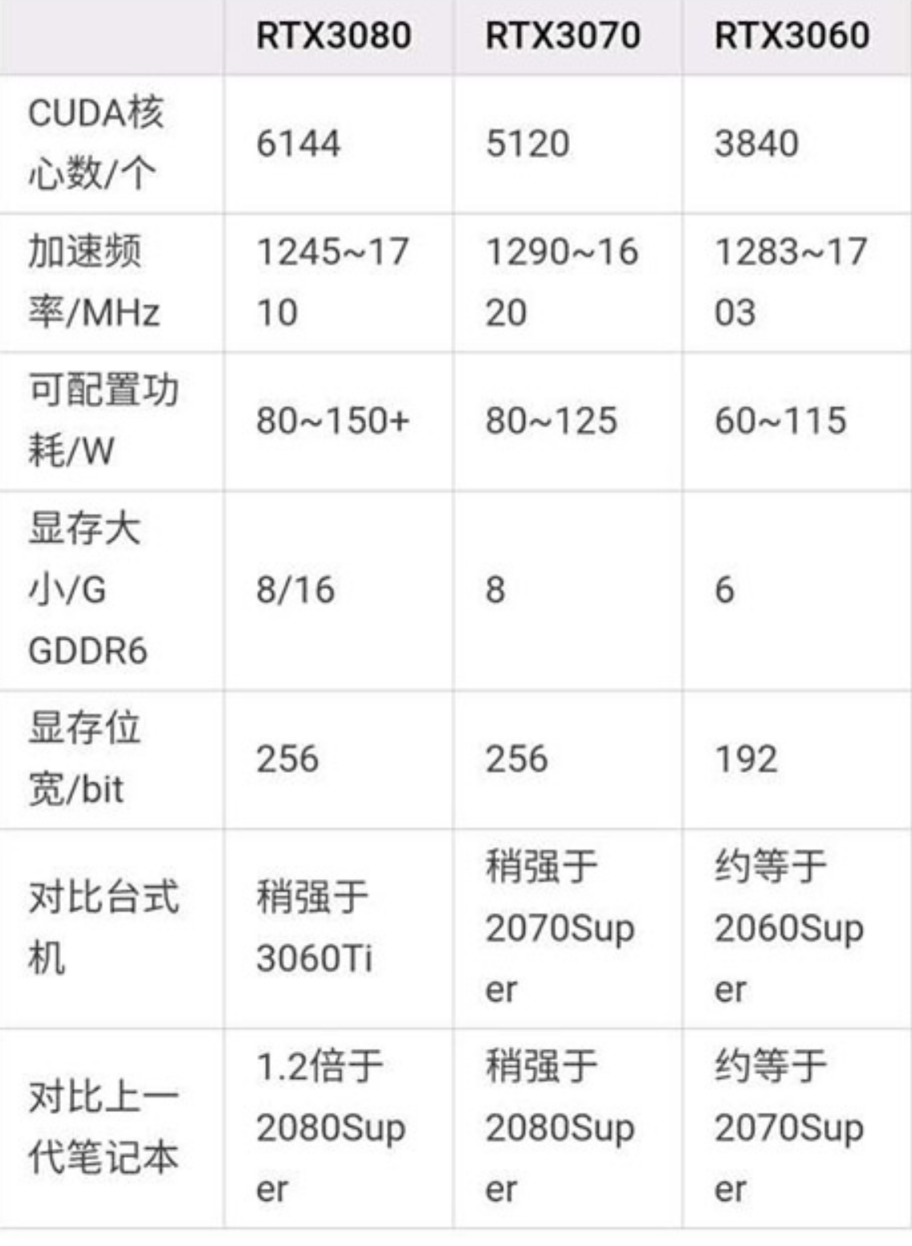 首先,笔记本的3070主要分为两个版本,就是残血版和满血版本。满血版,一般就是140W的版本,这个性能还是非常强悍的,在性能上大概和桌面3060TI显卡差不多,但是实际使用起来的话,肯定没有这么强悍。如果是残血版的话,也就是90W,那么目前这个表现大概和3060差不多,媲美桌面2070S显卡。参照下面的一些参数: