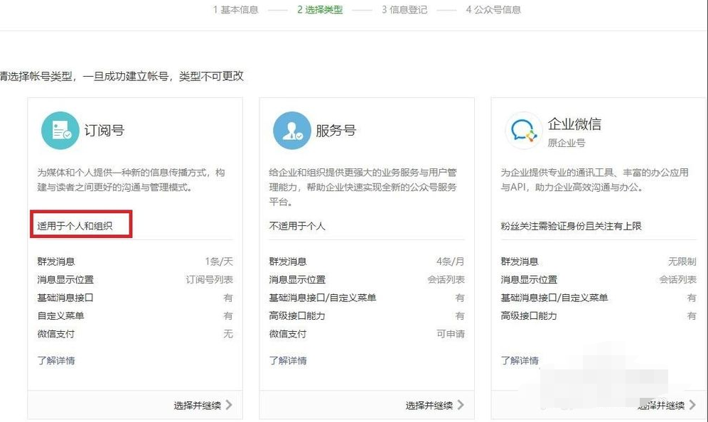 3、在该页面选择创建的公众号类型,由于我们是个人创建公众号,因此,只能选择订阅号,点击"选择并继续"。