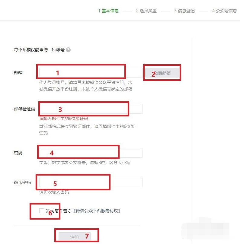 2、由于是个人微信公众号,我们选择创建订阅号。填写基本信息。按照图中所示步骤填写。