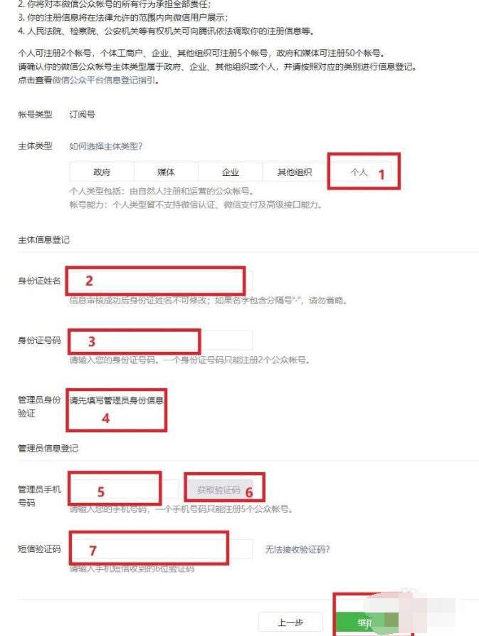 1. 选择主体类型为"个人"。2. 填写姓名。3. 填写身份证号。4. 进行管理员身份验证,点击此位置会弹出二维码,使用手机微信扫描此二维码即可将微信号设置为此公众号的管理员。5. 填写手机号。6. 获取验证码。7. 填入刚刚收到的验证码。8. 点击继续。
