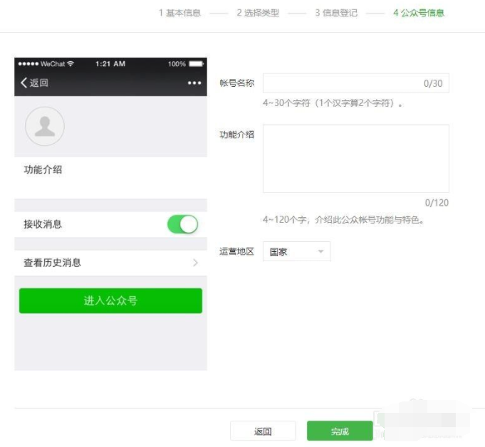 5、在该页面填写公众号名称和描述,并且选择国家和地区即可点击完成。