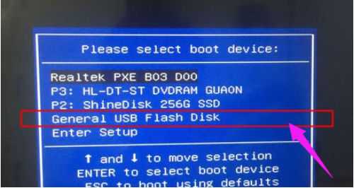 3、在需要破解开机密码的xp电脑上插入pe启动盘,启动电脑后不停按F12、F11、Esc等快捷键,在弹出的启动菜单选择框中选择识别到的usb启动项,比如General USB Flash Disk,按回车进入。
