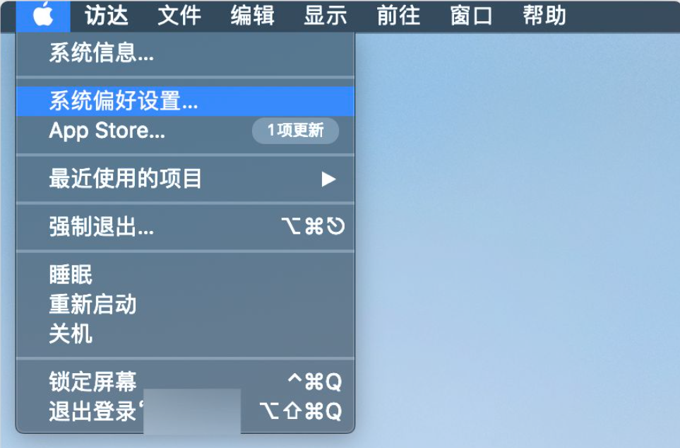 1、首先点击左上角的苹果图标,接着选择系统偏好设置。