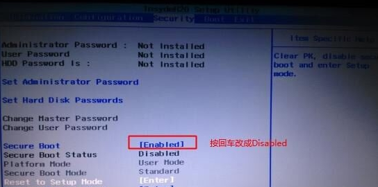 1、开机一直按F2或(FN+F2)进入BIOS,按→方向键切换到Security,选择Secure Boot回车设置成Disabled,关闭安全启动后才能改legacy传统模式引导U盘启动。