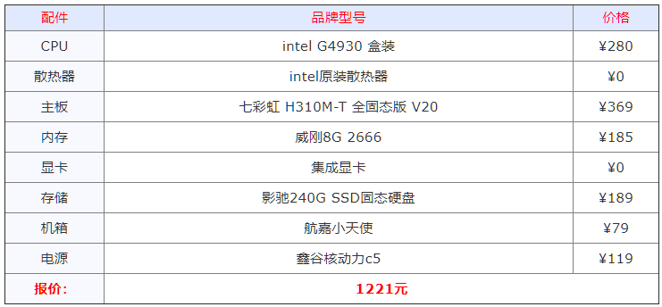 1.低端配置:这是最入门的配置,可以用来普通办公,上网、看视频。双核的G4930处理器满足这些需求完全够的,低功耗,低噪音,搭配上固态硬盘,整机操作还是很流畅的。