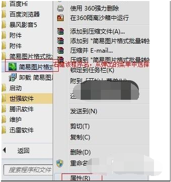 1、在桌面找看能不能找到文件的快捷方式,如果不能就打开开始菜单中,选中要卸载的程序右键,点击属性。