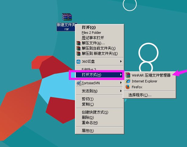 1、开始解压某一个文件,在刚刚压缩的文件上鼠标右键选择打开方式,在打开方式中选择解压软件,这里是WinRAR软件。