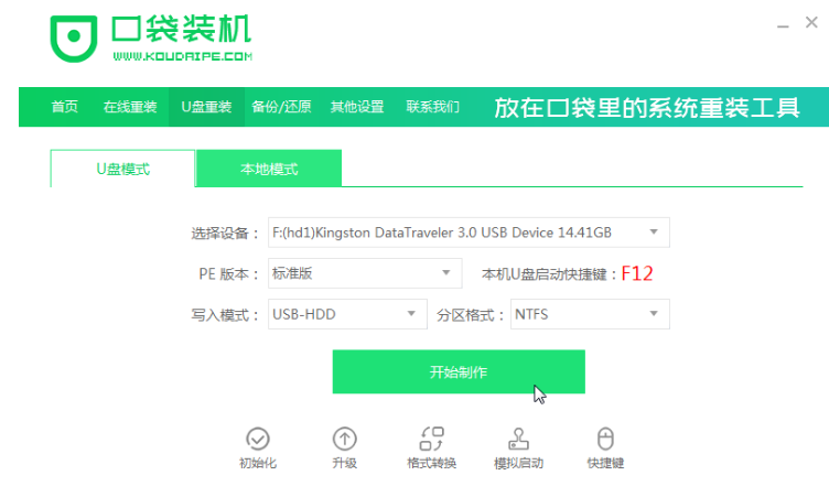 1、我们把一个8g以上的u盘插到联想笔记本电脑当中,然后打开桌面的口袋装机这个软件的快捷方式,进入首页之后。我们可以单击开始制作。