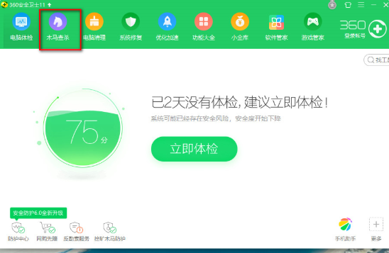 1、在打开的360安全卫士软件的主页面中,点击木马查杀功能。