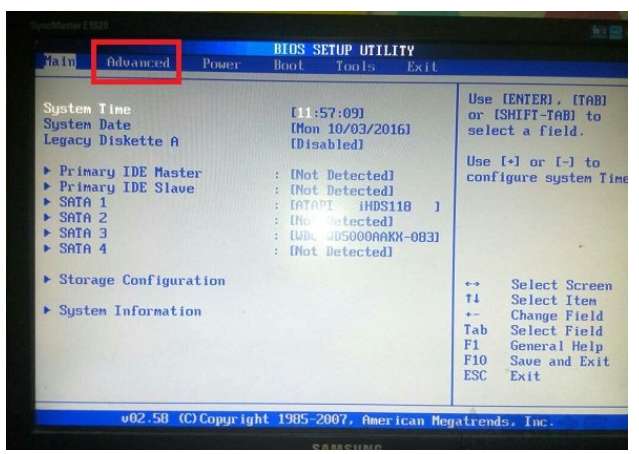 1,重启电脑,在电脑出现第一界面时快速的按下del键,进入bios界面,然后通过键盘上的左右键切换到在“Advanced”选项,进入下一步。如图所示;