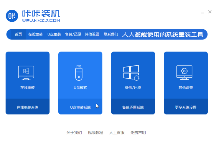 1.我们需要先关闭杀毒软件,然后双击打开桌面上的咔咔装机一键重装系统软件,选择“u盘模式”进入。