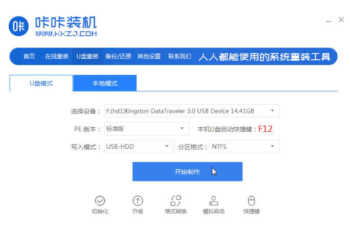 1、首先打开【咔咔装机一键重装系统】工具,我们插入一个空白u盘,选择【u盘重装系统】模式,点击【开始制作】。