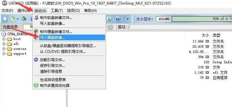 3、打开系统镜像文件后,点击【启动】>【写入硬盘映像】。