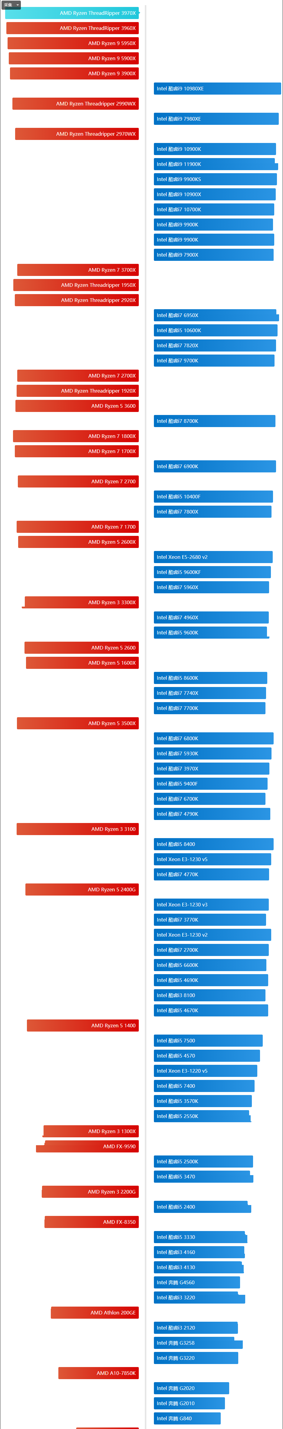 从图中可以看出,AMD锐龙3000系列的线程撕裂者3990X、3970X、3960X是位居前沿的,而Intel的九代酷睿 至强W-3175X 以及十代酷睿 i9-10980XE 也是紧随其后。这几款CPU都是近两年发售的高端CPU,价格昂贵的它们,性能自然也是位于顶端。