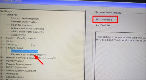 1、点击进入后选择左侧的secure boot enable的选项,在右侧选择为disabled。